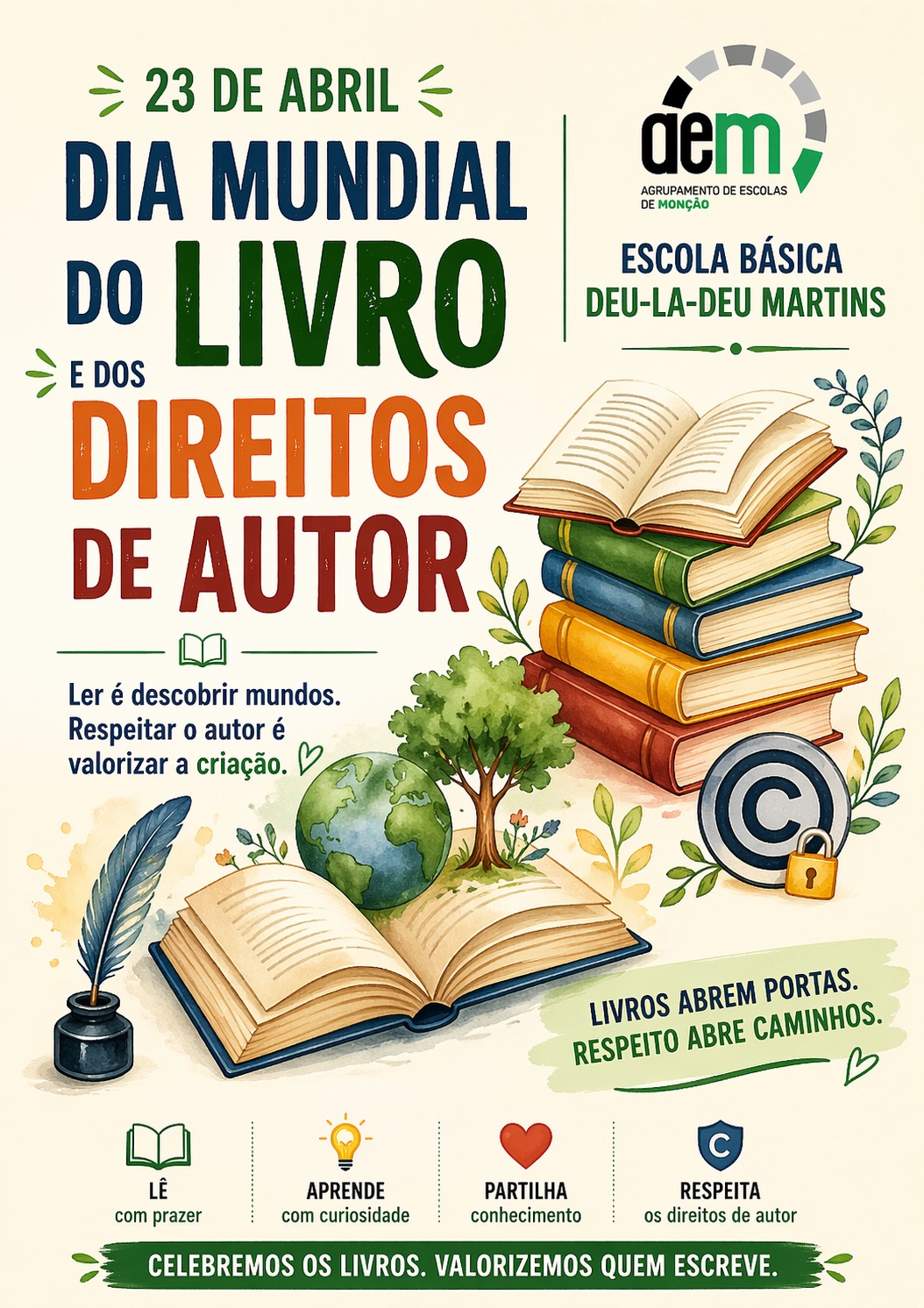 No âmbito da comemoração do Dia Mundial do Livro e dos Direitos de Autor, o grupo disciplinar de Português do 2.o ciclo, em articulação com o grupo de Educação Visual e Tecnológica, dinamizou uma iniciativa dedicada à promoção do livro, da leitura e da criação literária, enquanto dimensões essenciais da formação integral dos alunos. Com o objetivo de fomentar hábitos de leitura e sensibilizar para a importância dos direitos de autor, foi organizada uma exposição na Escola Básica Deu-La-Deu Martins. O espaço reuniu trabalhos realizados pelos alunos, evidenciando o seu envolvimento, criatividade e sentido estético. Reafirma-se a importância de continuar a promover o livro e a leitura em contexto escolar, enquanto instrumentos indispensáveis ao desenvolvimento pessoal, académico e social dos alunos.