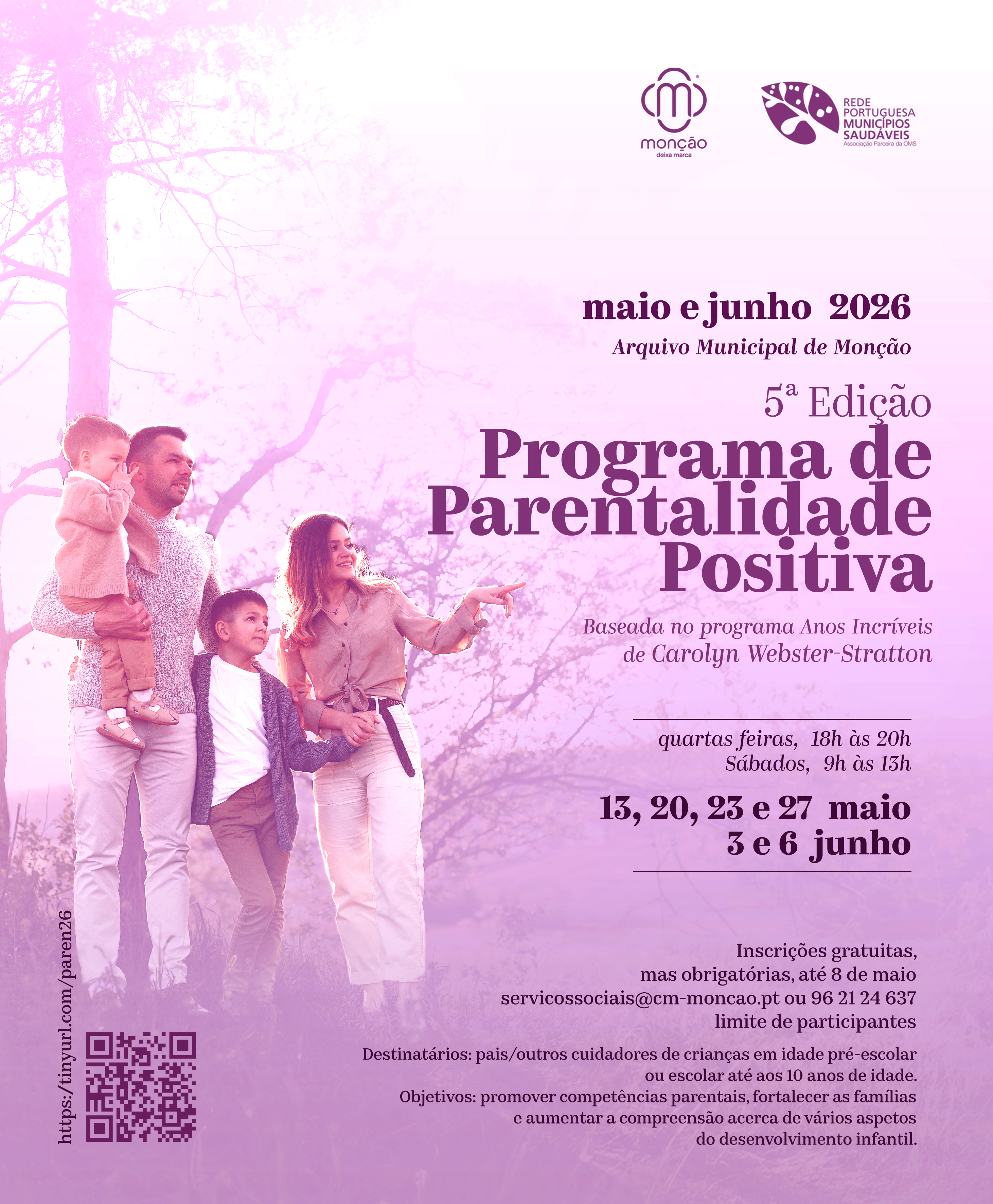 A 5.ª Edição do programa de parentalidade Positiva, baseado no Programa “Anos Incríveis”, de Carolyn Webster-Stratton, decorre entre 13 de maio e 6 de junho, ao longo de seis sessões, no Arquivo Municipal de Monção. O programa foi desenhado para promover as competências parentais, fortalecer as famílias e aumentar a compreensão acerca de vários aspetos do desenvolvimento infantil, de forma a prevenir e solucionar questões relacionadas com o comportamento das crianças.