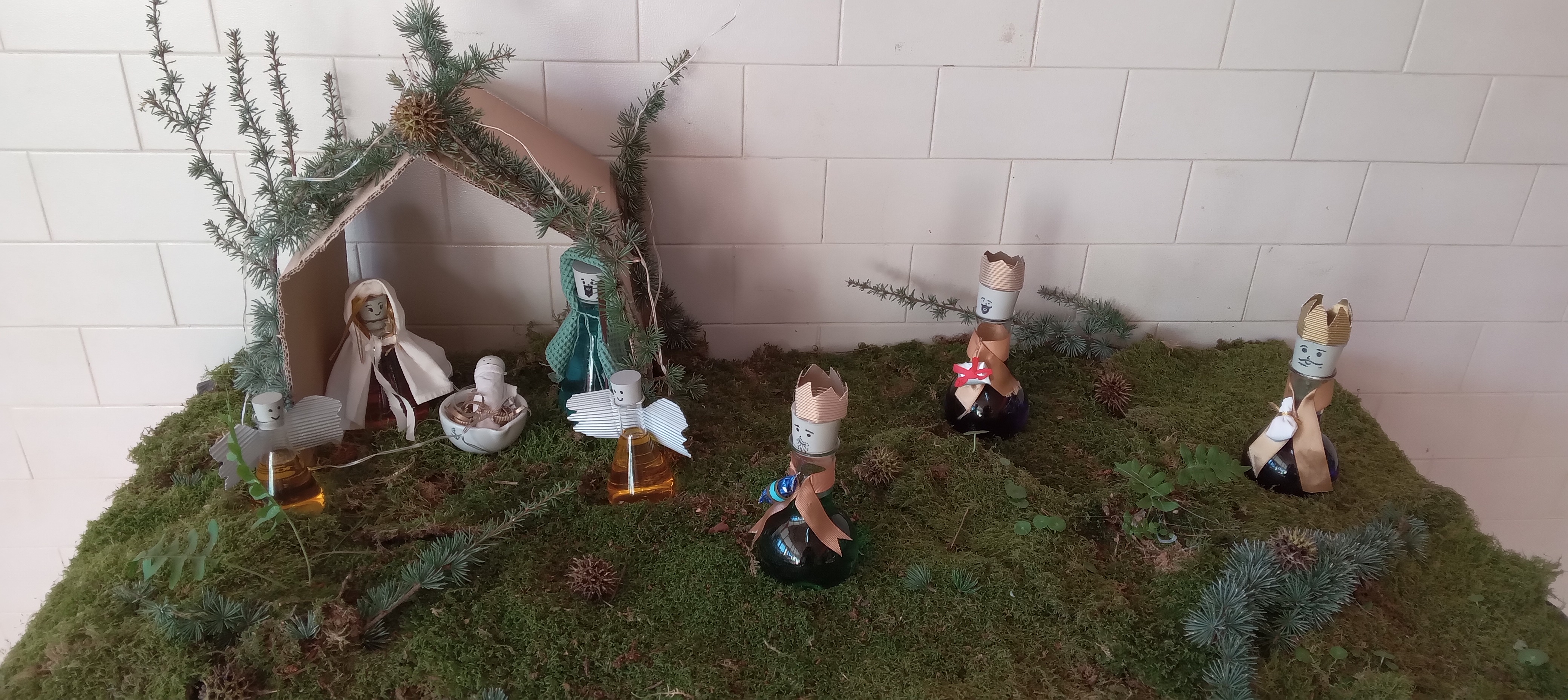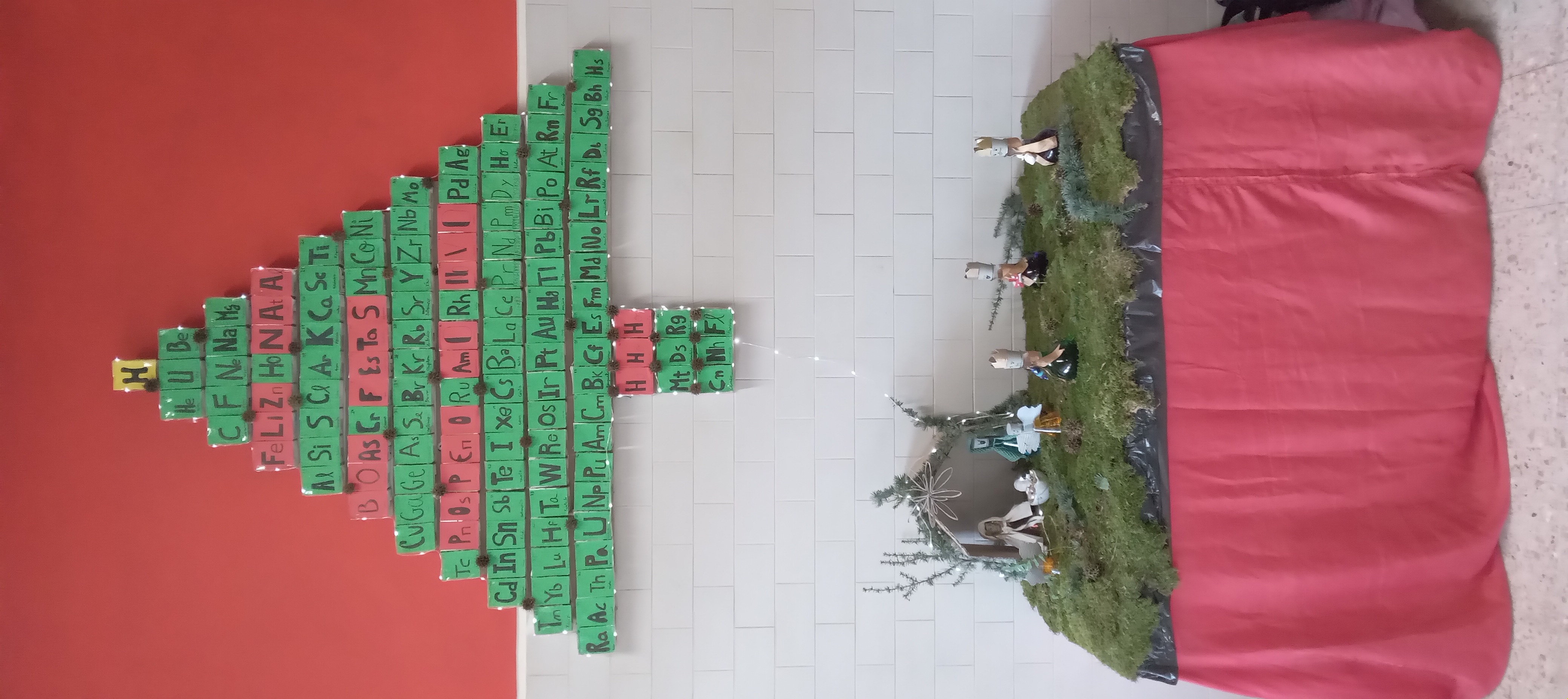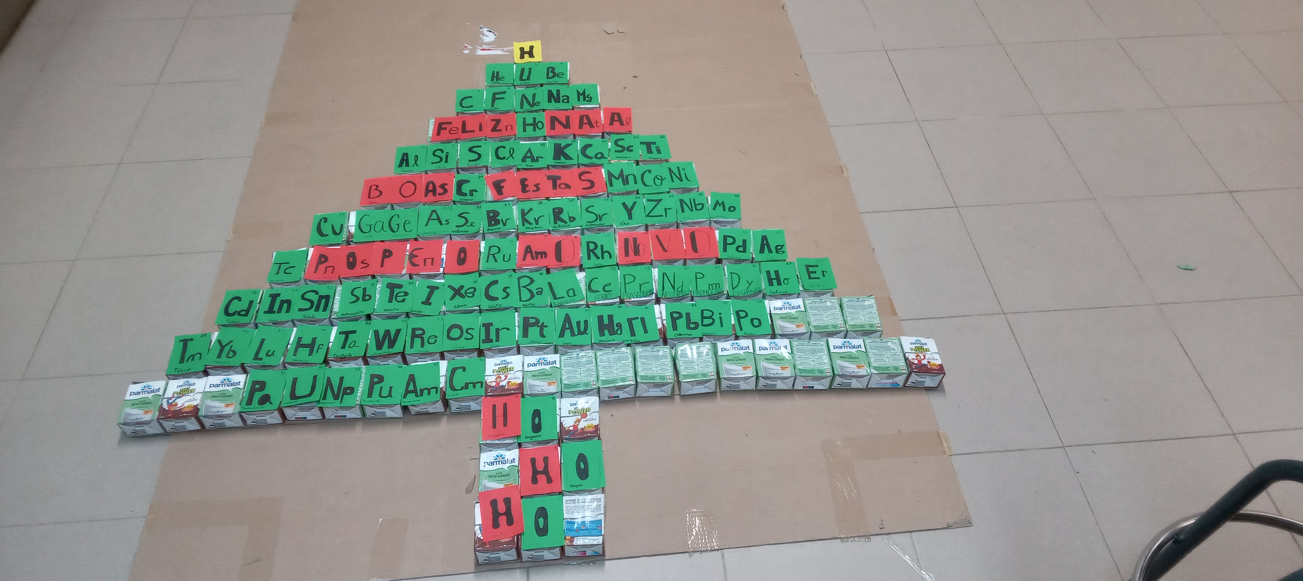 Neste desafio os alunos promoveram hábitos de reutilização de materiais, construindo uma árvore de Natal com pacotes de leite. Para a decoração da árvore contou-se com a colaboração dos alunos do 8ºG, que na aula de Físico-Química e de Educação Visual elaboraram cartões com os diferentes símbolos químicos que constituem a Tabela Periódica e também com a ajuda das professoras do pré-escolar e do 1ºciclo na recolha dos pacotes de leite.